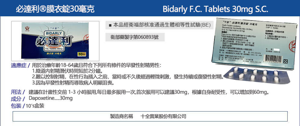 必達利 Bidarly 30mg 是一款專門針對男性早洩(PE)問題所研發的處方用藥,含有活性成分 達泊西汀(Dapoxetine),屬於選擇性血清素再吸收抑制劑(SSRI)。此藥品為 Priligy 原廠藥的學名版本,具相同藥效,能有效延長射精時間、提升性控制力,幫助男性擺脫「一觸即發」的困擾,重拾性生活的信心與滿足感。