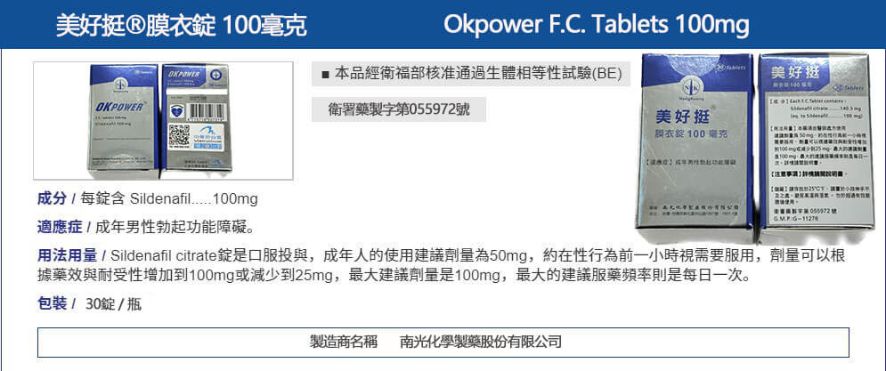 美好挺 OKPOWER 100mg (瓶裝版)是一款專為成年男性設計的壯陽口服藥品,屬於 PDE5 抑制劑類藥物,其主要成分為 Sildenafil Citrate(西地那非),與原廠威而鋼相同,具備迅速改善勃起功能障礙(ED)與提升陰莖硬度的功效。瓶裝版本設計便於保存與長期使用,深受需要穩定性能力輔助的男性青睞。