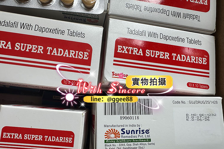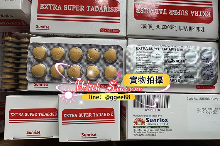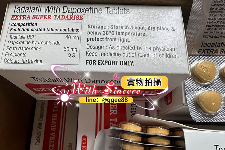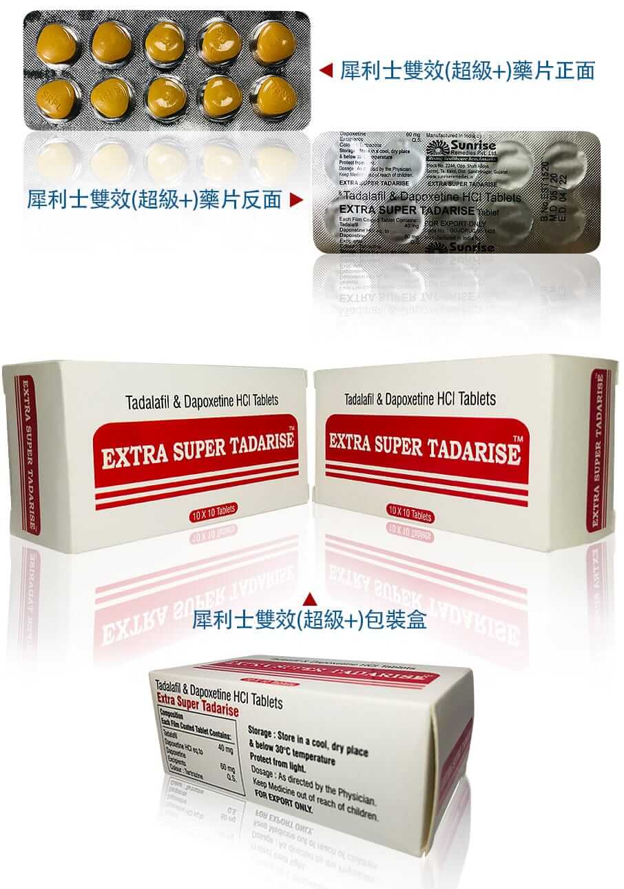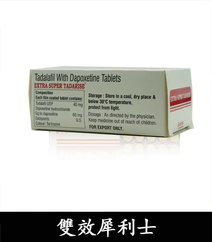 Super Tadarise印度雙效犀利士是一種強大的藥物,逐漸成為台灣眾多男士的認可和青睞,它的效果非常顯著,可以幫助男性治療陽痿和早洩。 印度Super Tadarise雙效犀利士成份為他達拉非與達泊西汀。每1粒SUPER TADARISE超級雙效犀利士包含他達拉非40mg(1粒犀利士)+ 達泊西汀60mg,具有助勃與延時雙重功效。因其效果非常猛,建議房事提前1-3小時服用,並且配一大杯溫開水。